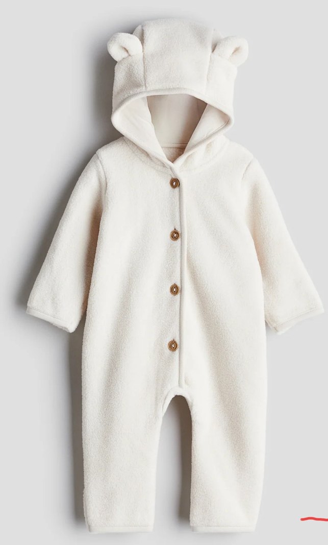 Bebek kız için düğmeli, yumuşak kumaştan beyaz tulum. Kapüşonunda sevimli kulak detayları ve kesimli yaka bulunur. ❄️