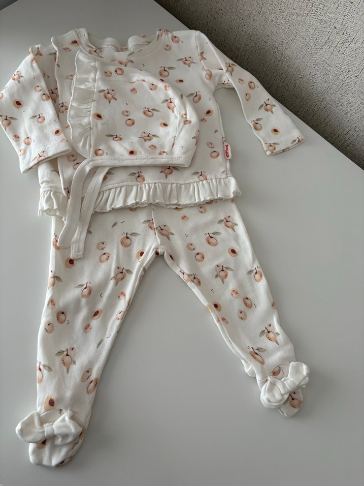 Bebek kız takımı, pastel beyaz renkte, baskılı desenli ve uzun kolludur. Üstte fırfır detayları ve fiyonklu ayaklı pantolon içerir.