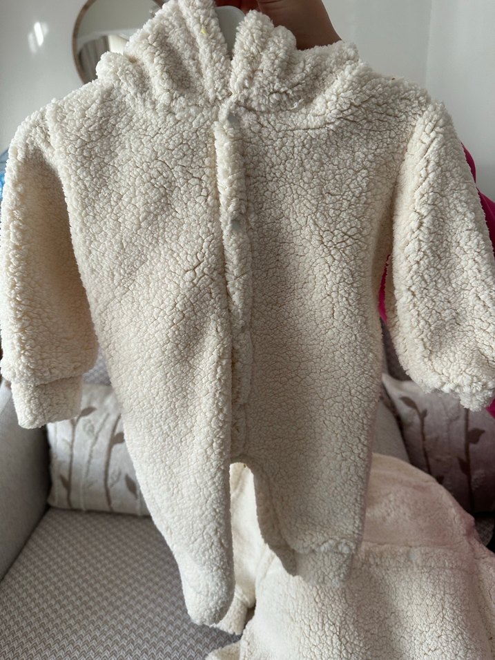 Yumuşak ve sıcak beyaz bebek kız tulumu, kürk detaylı ve yuvarlak yakalı, miniklerinizi sıcak tutar. ❄️