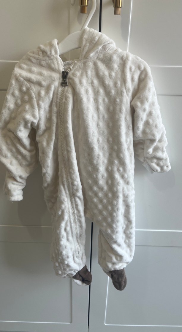 Beyaz, kürklü detaylı, dokulu kumaştan bebek kız tulumu. Yaka kısmı kesimli ve sıcak tutar. ❄️6/9 ay