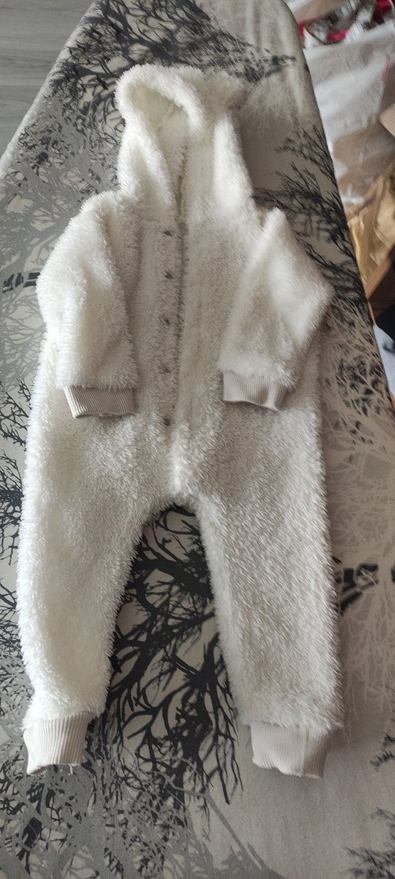 Beyaz, kürklü detaylı, yuvarlak yakalı bebek kız tulumu. Yumuşak ve sıcak dokusu ile soğuk havalar için uygundur. ❄️