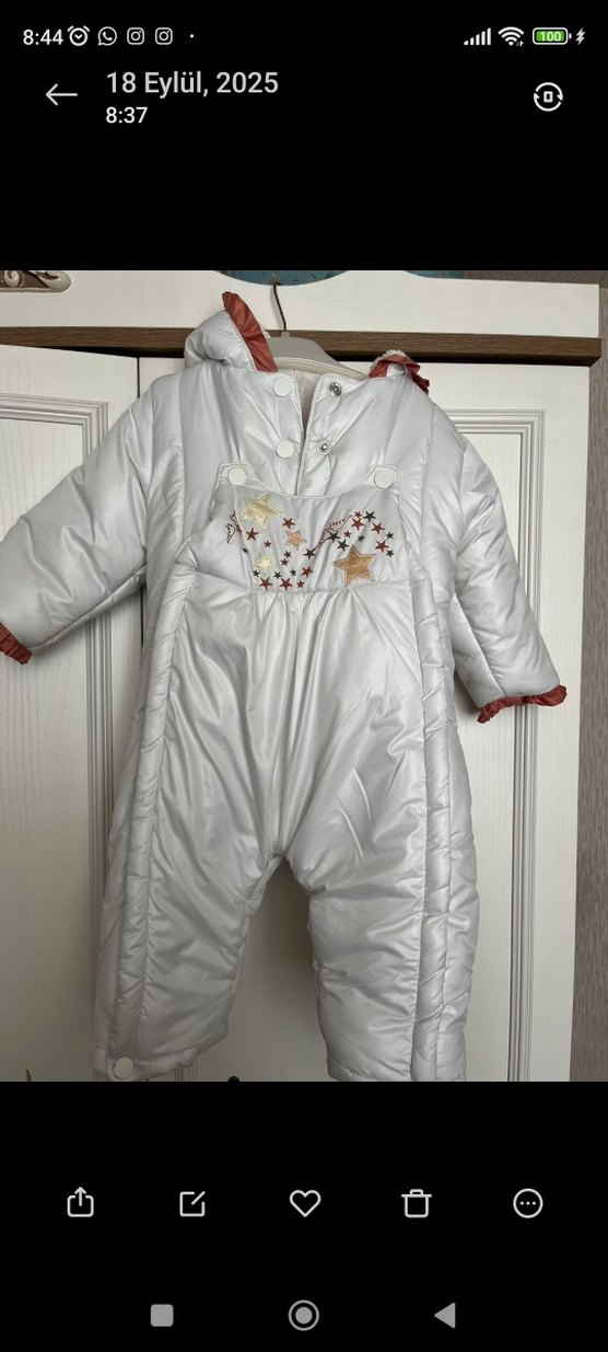 Beyaz bebek kız tulumu, düğmeli ön ve nakışlı yıldız desenli. Çentikli yaka ve yumuşak, sıcak dokuda. ❄️ürün 3 aylıkken kullanılmaya başland. büyük oluyordu ama soğuklarda çok güzel sarmaliyordu. içi polar. sıcak tutuyor