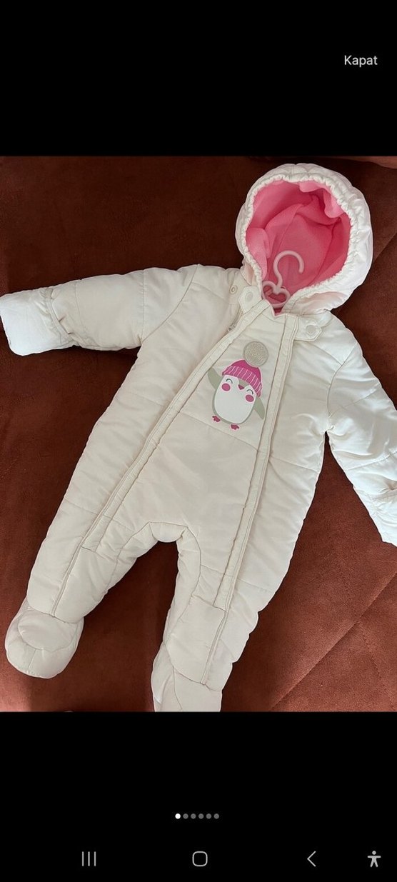 Bebek kız için beyaz şişme tulum, notched lapel yakalı ve yumuşak pastel astarlı. Önünde sevimli penguen deseni bulunur. ❄️ indirim payı var kusursuz bir ürün 3 6 ay