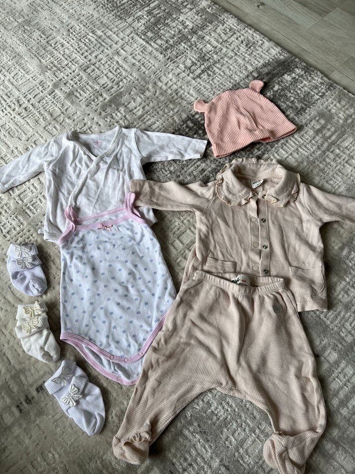 Beyaz uzun kollu üst, yumuşak bej pantolon ve ceket, kulaklı pastel pembe şapka, küçük pastel detaylı beyaz body ve uyumlu çoraplardan oluşan rahat şık bebek kıyafet seti. Hepsi tertemiz chicco,İdil baby ,civil ve waikiki ürünleridir.yenidoğan ve 1-3 ay ürünleridir .peöbe takım bandanalıdır