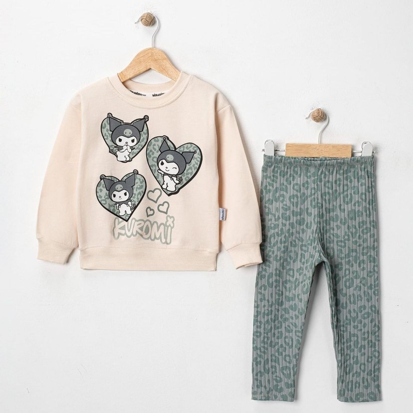Bebek kız için örme uzun kollu, Kuromi karakter baskılı üst ve desenli tayttan oluşan pastel bej tonlarında takım. 2 Yaş 3 Yaş 4 Yaş 5 Yaş Bedenleri mevcut.