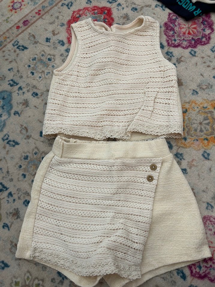 Bebek kız için örgü kolsuz üst ve düğmeli şorttan oluşan pastel beyaz takım. Desensiz ve şık bir tasarıma sahiptir. 4 yaştır