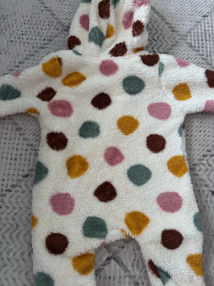 Bebek kız tulumu, yumuşak örgü dokusu ve pastel çok renkli puantiyeli deseniyle dikkat çeker. Yuvarlak yakalı ve sıcak tutar. ❄️