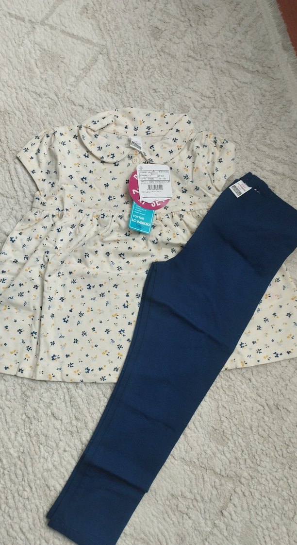 Bebek kız için kısa kollu, yakalı desenli elbise ve mavi tayt takımı. Rahat ve şık bir kombin sunar.