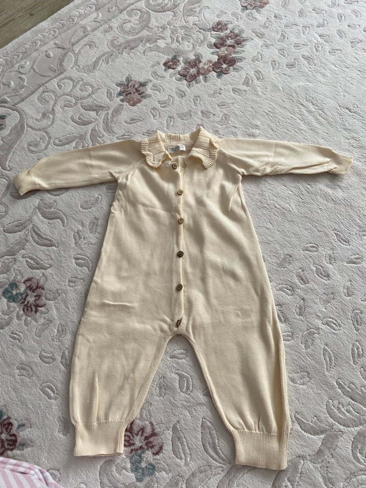 Bebek kız tulumu, düğmeli ve uzun kolludur. Krem renkte, desensiz ve triko kumaştan üretilmiştir.