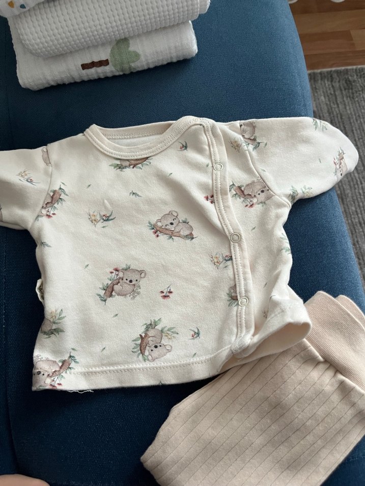 Beyaz renkli, baskılı ve düğmeli bebek kız hastane çıkışı kıyafeti, pastel tonlarıyla yumuşak bir görünüm sunar.