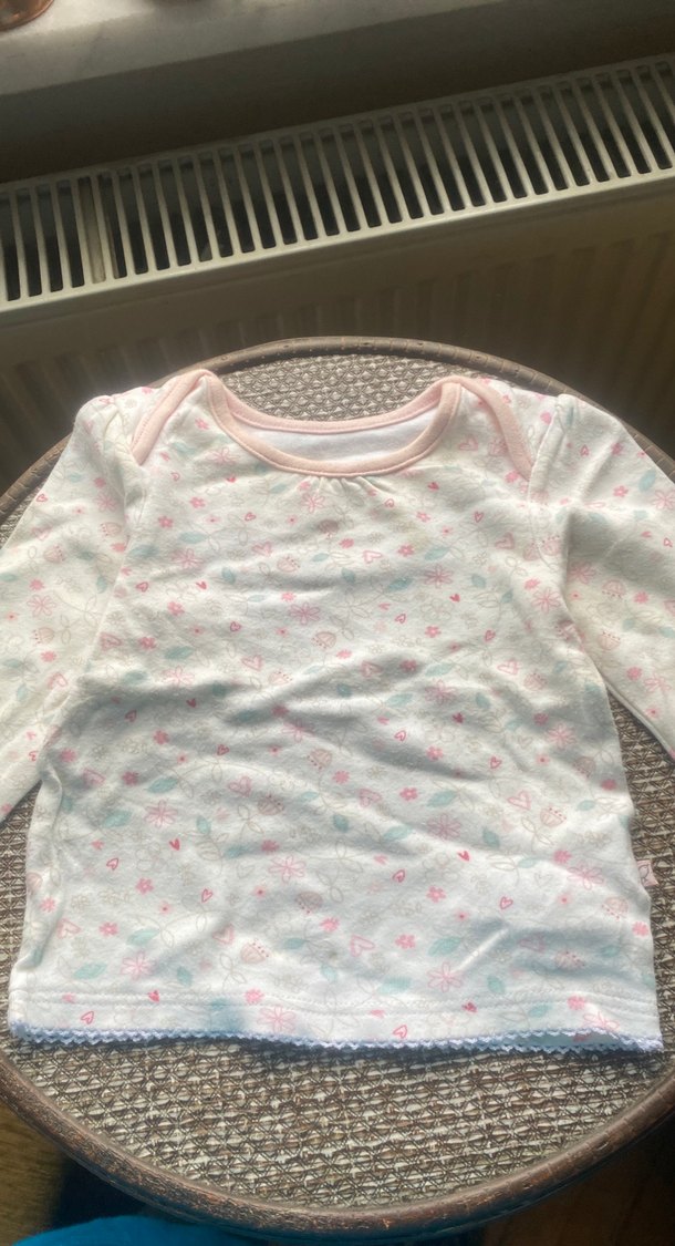Uzun kollu, yumuşak kumaşlı beyaz bebek kız hastane kıyafeti, pastel çiçek desenleri ve dantel süslemeye sahiptir.