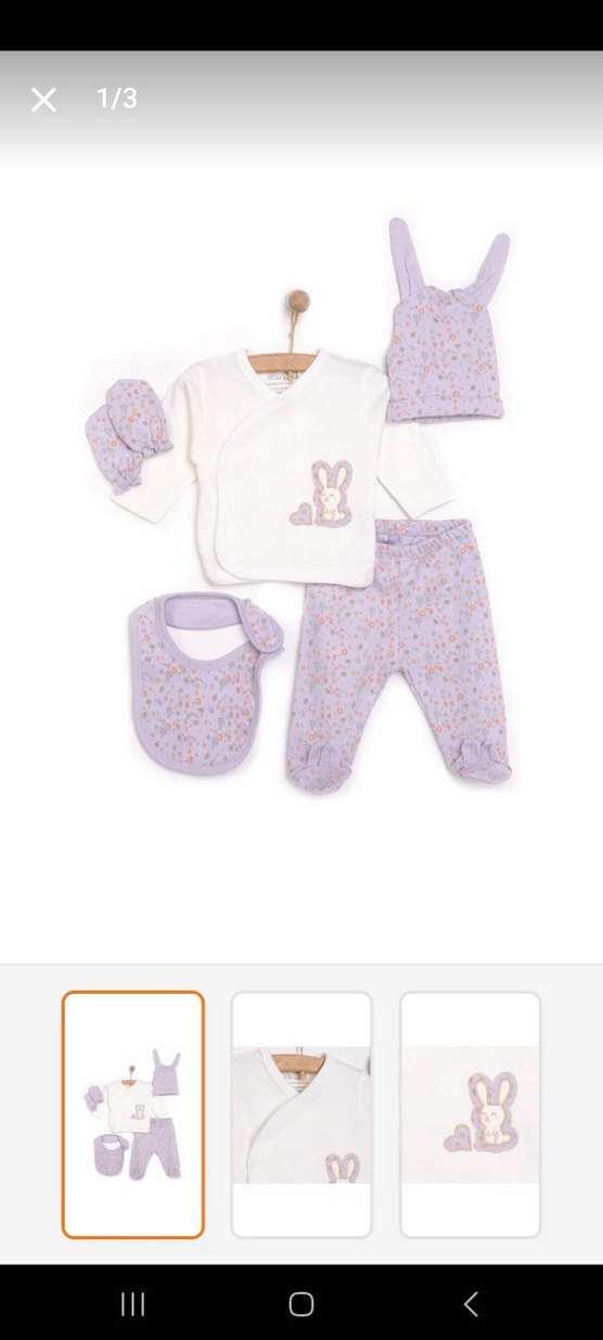 Uzun kollu sarmalı üst, tavşan baskılı, ayaklı, bağlama desenli pantolon, askılı üst, eldiven ve önlükten oluşan mor pastel tonlarda dantel detaylı bebek kız hastane seti. Severek Kullanıldık