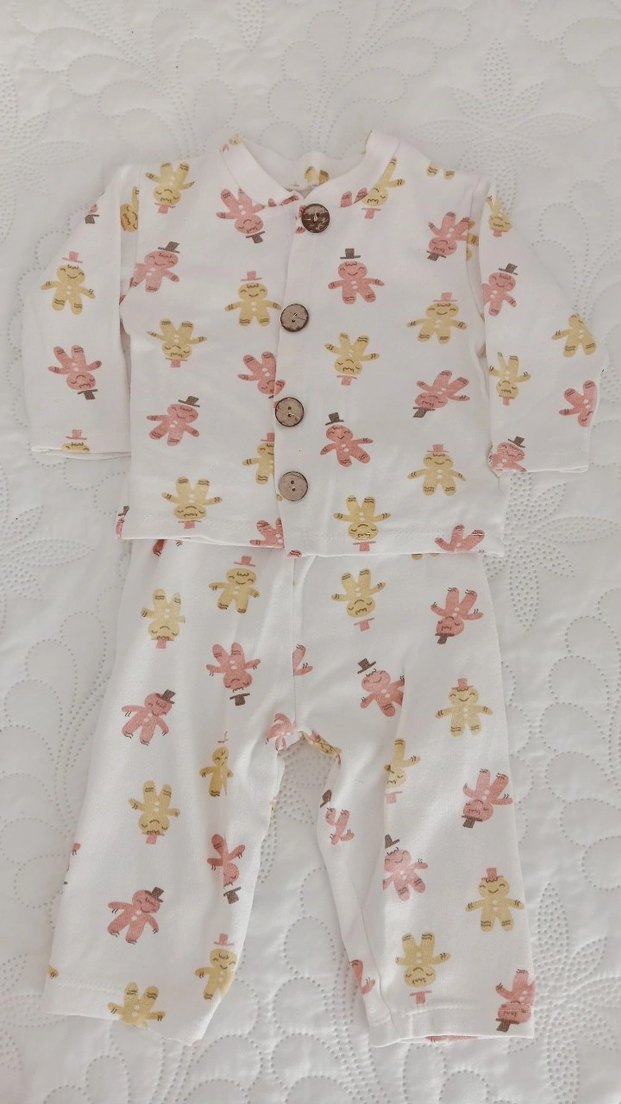 Bebek kız hastane takımı, düğmeli üst ve pantolon, pastel renkli baskılı desene sahip, beyaz zemin üzerinde yumuşak ve rahat kumaş.