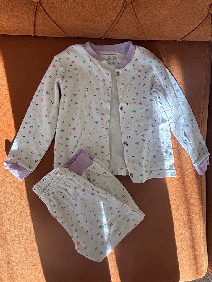 Bebek kız için düğmeli uzun kollu üst ve pantolon, beyaz zemin üzerinde pastel renkli tie-dye desenlidir. Yumuşak kumaştan üretilmiştir.