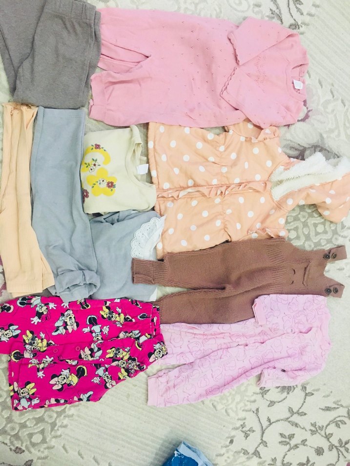Bebek kız için pastel renkli, örgü uzun kollu parçalar içeren kıyafet seti. Pembe ve yumuşak tonlarda, rahat, desensiz ve puantiyeli detaylar bulunur.