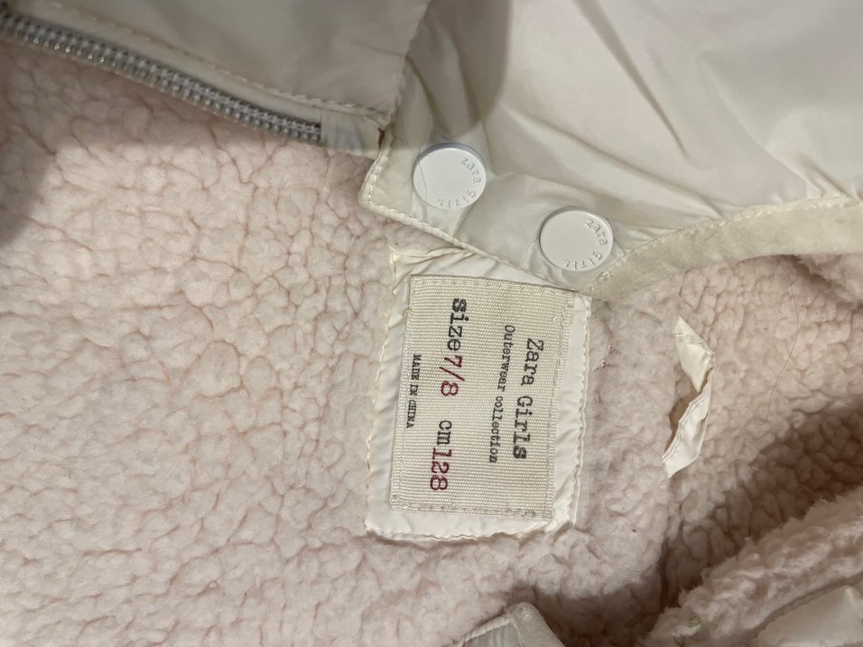 Zara Girls markalı, kapüşonlu, düğmeli, pastel beyaz renkli ve desenli bebek kız tulumu. Yumuşak ve sıcak kumaştan, 7/8 yaş için uygundur. ❄️
