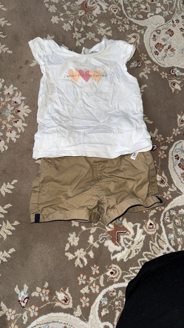 Bebek kız için kısa kollu beyaz tişört ve açık kahverengi şorttan oluşan rahat ve sade bir kombin. Kalp desenleriyle hafif şıklık sağlar.