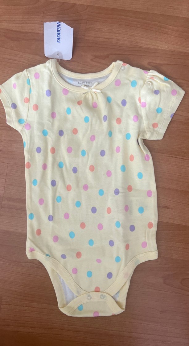 Pastel renkli, kısa kollu, bisiklet yaka ve düğmeli tasarıma sahip bebek kız body. Çok renkli puantiyeli deseniyle neşeli bir görünüm sunar.
