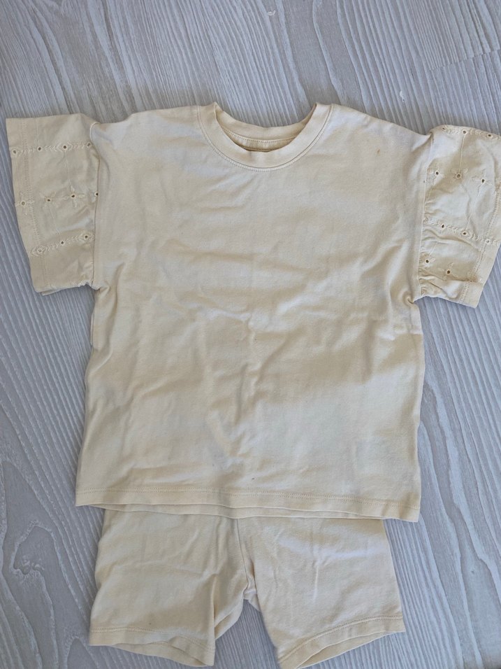 Bebek kız için kısa kollu, kolları delikli detaylı, yumuşak pastel beyaz kumaştan yapılmış rahat ve şık bir takım.