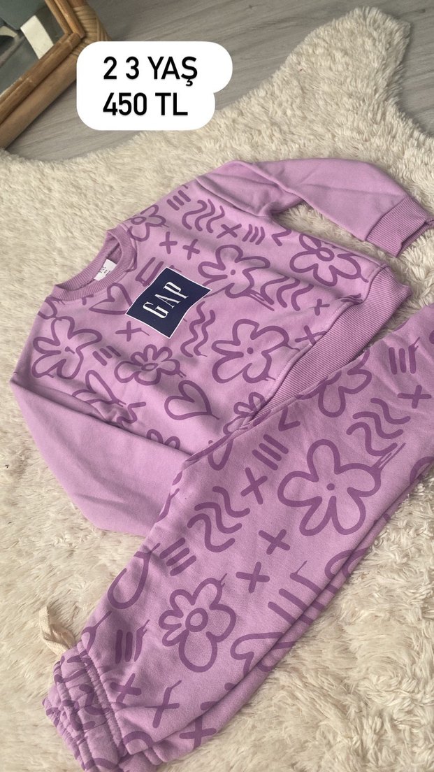 Mor pastel renkte, uzun kollu triko bebek kız takımı. Üstte GAP logosu ve eğlenceli desenler bulunur. Fiyatı 450 TL.