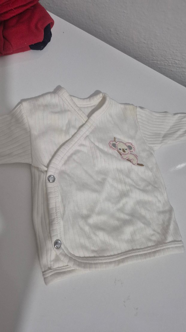 Nakışlı detaylara ve düğme kapamalara sahip pastel beyaz bebek kız hastane kıyafeti, yumuşak ribanalı kumaştan üretilmiştir.