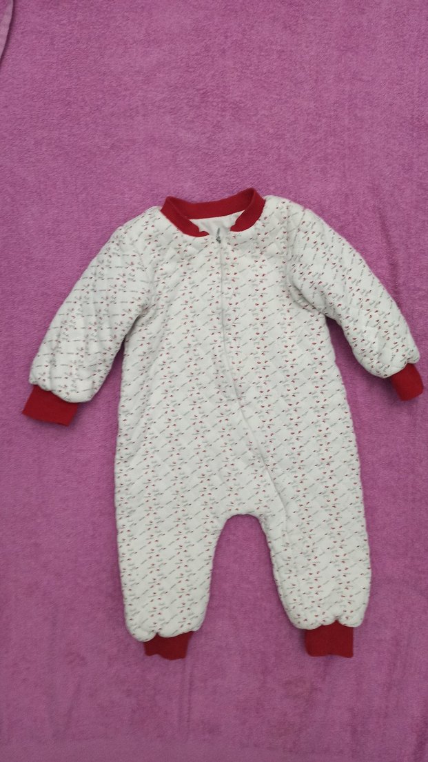 Bebek kız tulumu, renkli desenli beyaz örgü kumaştan, yuvarlak yakalı ve kırmızı manşetli olarak tasarlanmıştır. ❄️ Tertemiz ve sorunsuzdur.