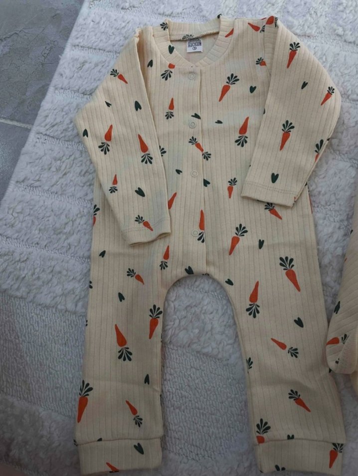 Örgü bebek kız tulumu, pastel beyaz zemin üzerine baskılı havuç desenine sahiptir. Uzun kollu ve rahat kesimlidir.