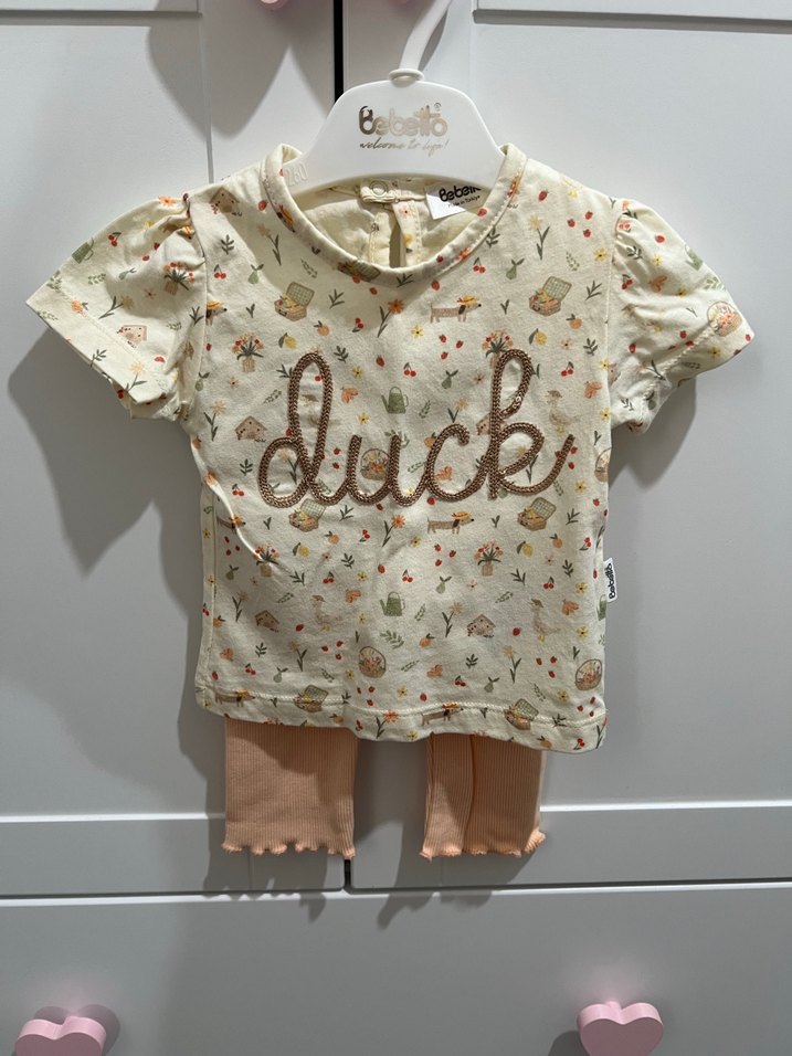 Bebek kız için kısa kollu, örme ve baskılı üst ile uyumlu pastel bej renkli pantolon takımı.