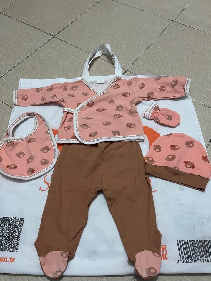 Bebek kız için örme uzun kollu, baskılı pastel desenli üst, kahverengi ayaklı pantolon, şapka, eldiven ve önlükten oluşan takım.
