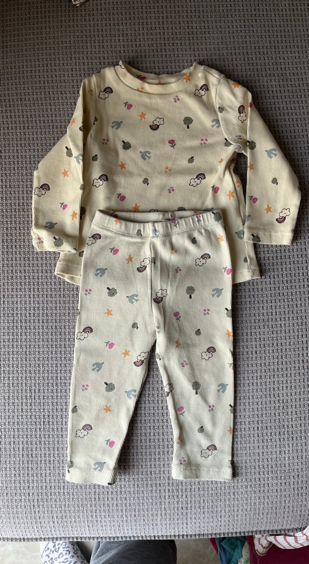 Bebek kız için örme uzun kollu üst ve pantolon takımı. Pastel beyaz renkte, küçük renkli desenlerle süslenmiş, yumuşak ve rahat kumaş.12 18 ay
