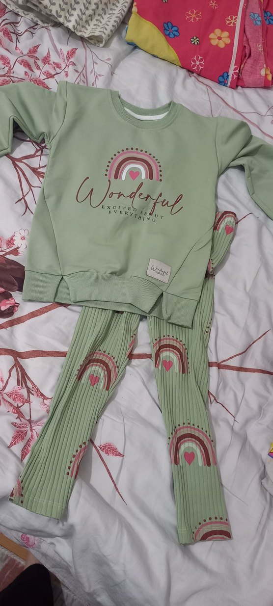 Bebek kız için pastel renkli, baskılı triko takım. Uzun kollu, yuvarlak yaka, bol kesim ve pileli detaylıdır. Üstte "Wonderful" yazısı bulunmaktadır.