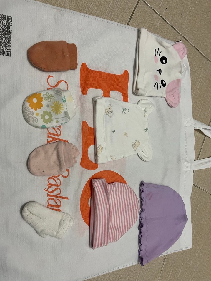 Bebek kız için pastel renklerde, dantelli ve desenli kolsuz üstler ile yumuşak şapka ve eldivenler içeren kıyafet seti.