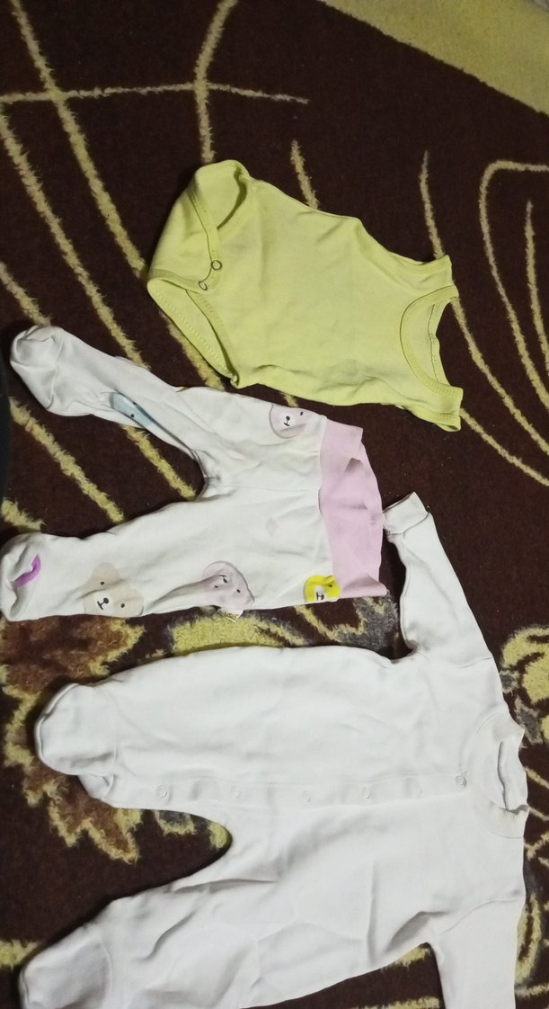 Pastel bebek kız takımında düğmeli uzun kollu beyaz body, hayvan figürlü yumuşak patikli pantolon ve kolsuz sarı üst bulunur.