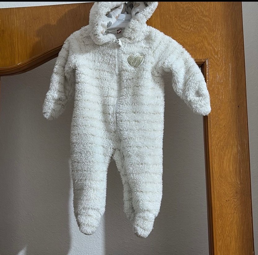 Bebek kız tulumu, yumuşak peluş detaylı beyaz renkte, kesik yaka ile. Desensiz ve gri kalp detayı bulunur. ❄️ Gb baby kız bebek tulum