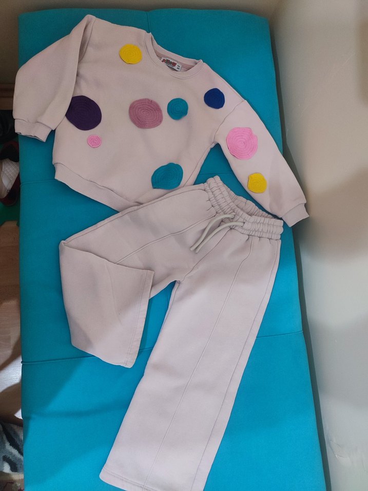 Pastel beyaz, uzun kollu bebek kız takımı. Renkli puantiyeler ve düğme detayları bulunur. Rahat ve yumuşak kumaşlıdır. 5-6 yaş