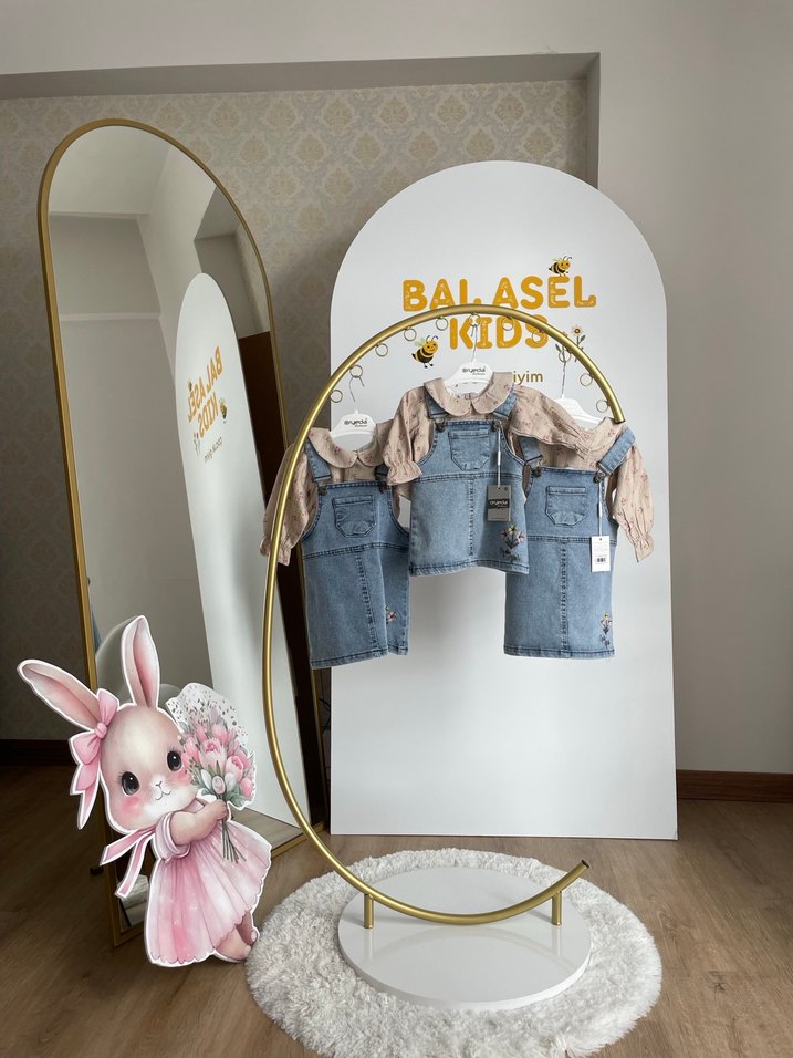 Pastel altın renkli, uzun kollu püsküllü üst ve baskılı denim elbiseden oluşan bebek kız kıyafet seti. Marka: BALASEL KIDS. 6-9ay/12-18ay/18-24 ay bedenleri mevcut adet fiyatıdır. İç gömleği %100 pamuktur