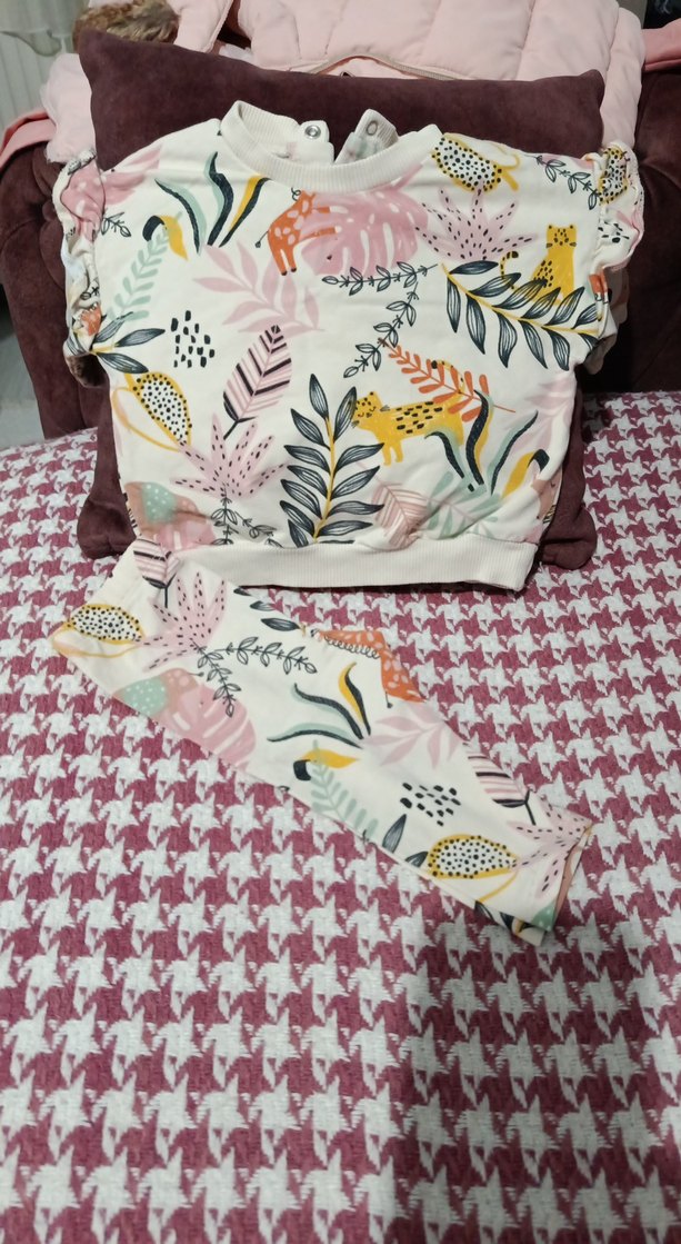 Bebek kız için pastel renklerde, uzun kollu ve fırfırlı detaylı, yumuşak ve rahat bir takımdır.
