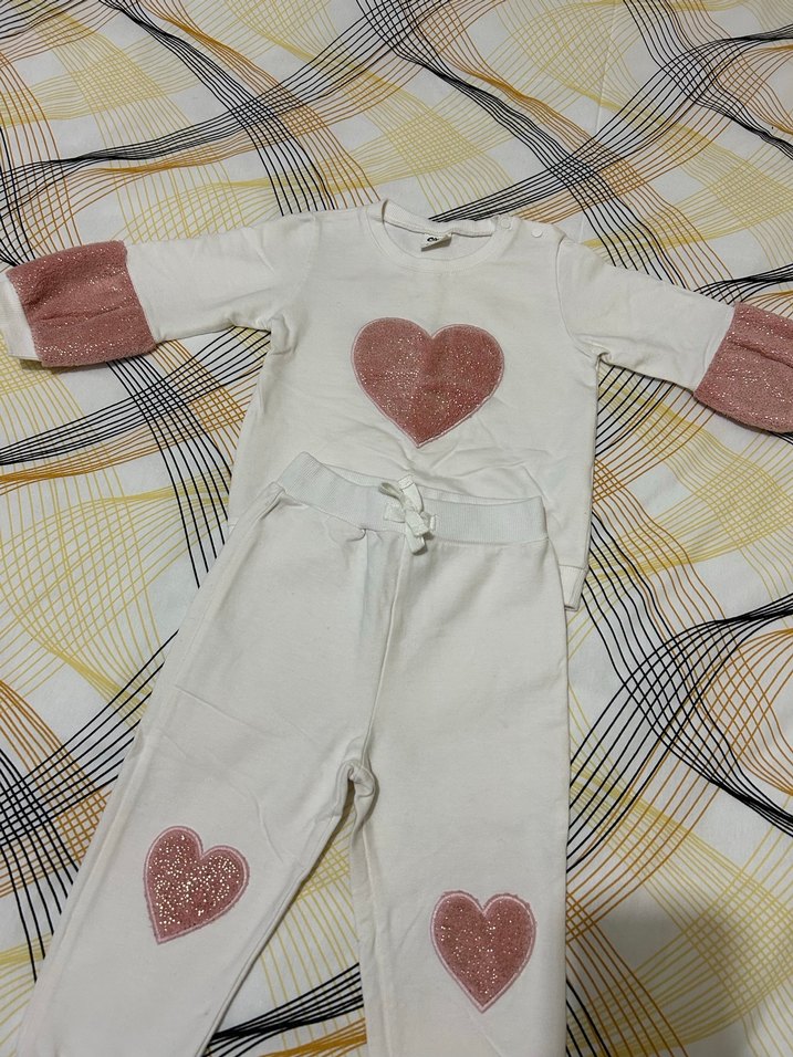 Uzun kollu, kalp desenli bebek kız takımı.beyaz kumaştan, yumuşak ve rahat bir kullanım sunar. 18-24 ay için uygundur