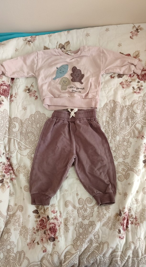 Uzun kollu, pastel pembe tonlarda, hayvan figürlü üst ve rahat bel bantlı pantolondan oluşan bebek kız takımı. Cigit markadır.