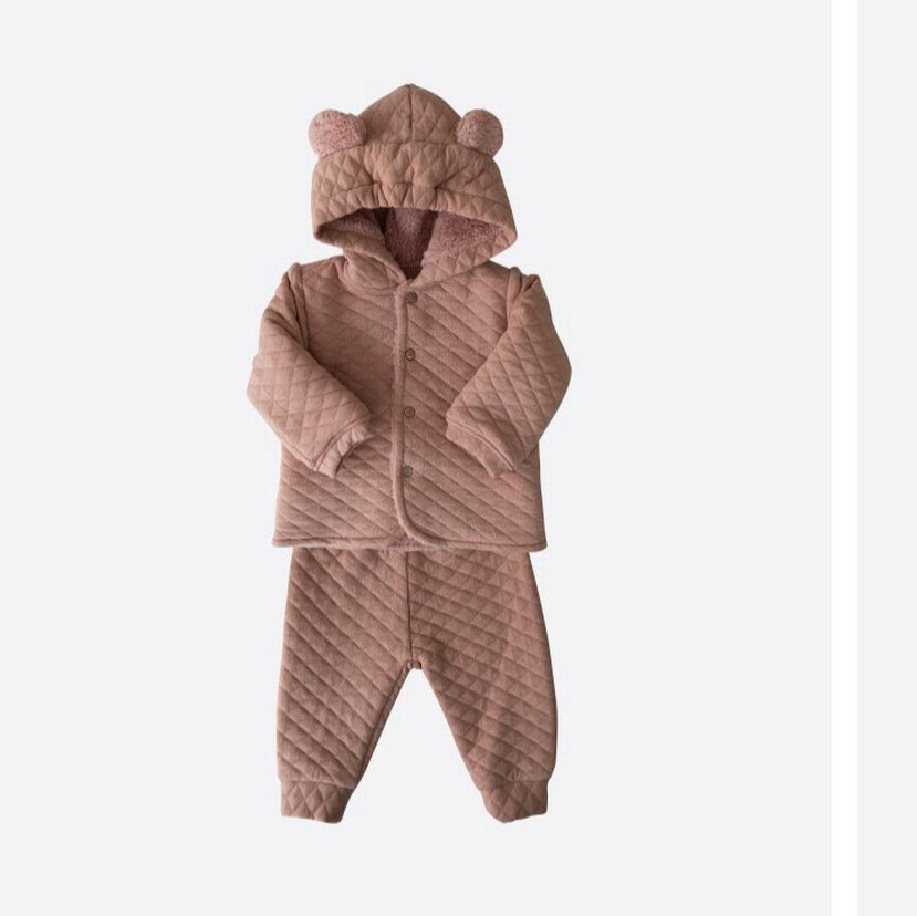 kapüşonlu ayıcık kulaklı uzun kollu üst ile eşleşen pantolonlardan oluşan bebek kız takımı. 3.6 aylık tüğlenmesi var
