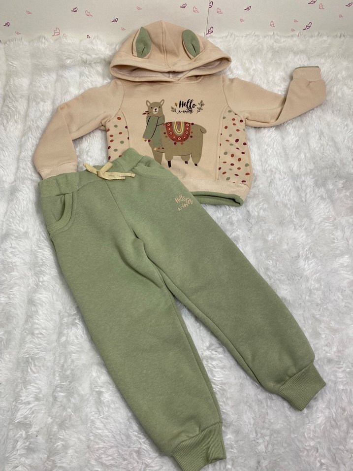 Bebek kız için triko kapüşonlu, uzun kollu, lama baskılı camel renk üst ve pastel yeşil yumuşak kumaş pantolon takımı.