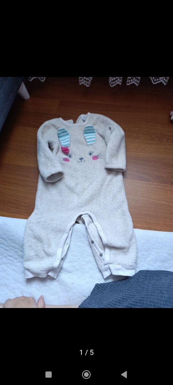 bebek kız tulumu. Önünde sevimli tavşan yüzü deseni bulunur. Uzun kollu ve kolay giydirme için düğmeli. 12.18 ay