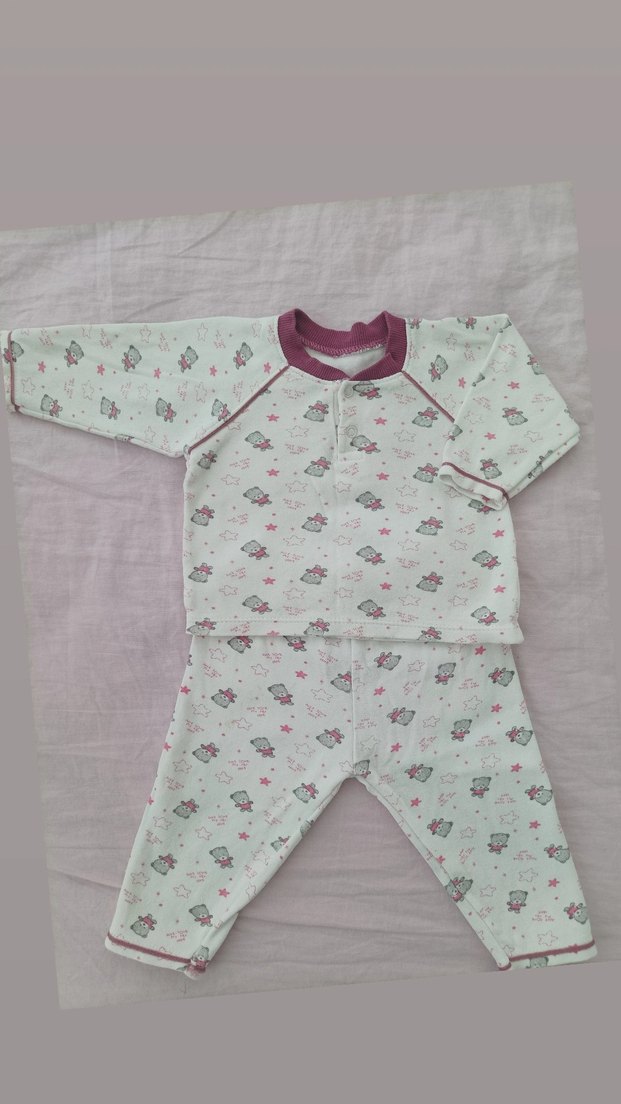 Bebek kız için uzun kollu, örgü dokulu, pastel beyaz renkli, baskılı desenlere sahip takım. Üstte kontrast yaka detayı bulunur.
