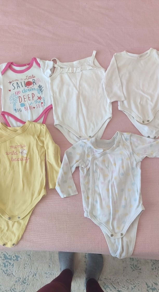 Uzun kollu, yuvarlak yakalı bebek kız bodysuitleri, pastel ve beyaz tonlarda, sade ve şık tasarımlarla, eğlenceli yazılar ve hafif desenler içerir. hafif lekeler olabilir otganik deterjanla yıkandılar. pembe ve uzun kollu beyaz bir 3 aya kadar diğerleri 9 aya kadar. etiketlerini kestiğim için üst sıradaki üç tanesini göz kararı söyledim.
