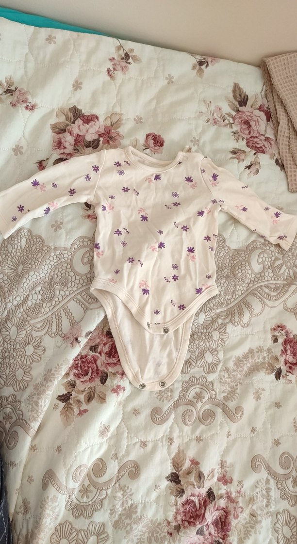Beyaz zemin üzerine pastel çiçek desenli, uzun kollu, yakalı ve dantelli bebek kız body.