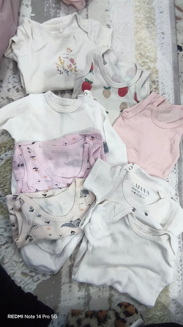 8 adet bebek kız için uzun kollu, yuvarlak yakalı, beyaz renkte ve ince dantelli detaylara sahip yumuşak kumaştan body.
