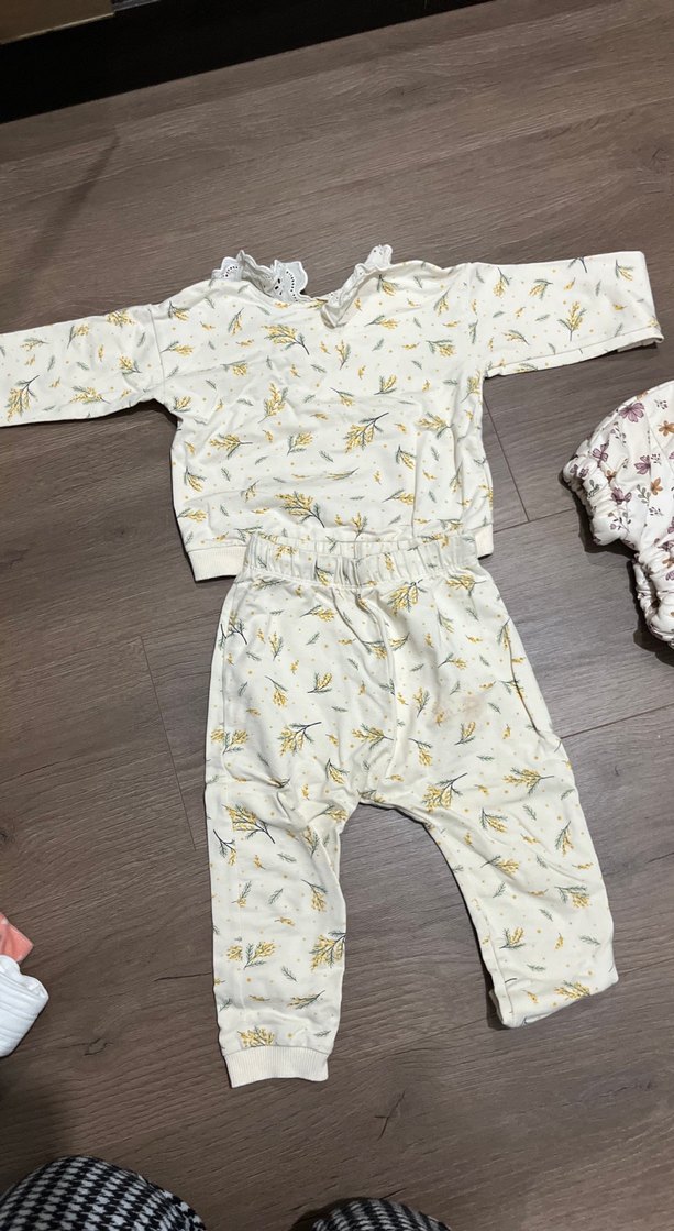 Bebek kız takımı uzun kollu, dantelli yakalı ve pastel beyaz renkli çiçek desenlidir. Yumuşak kumaşıyla konfor sağlar.
