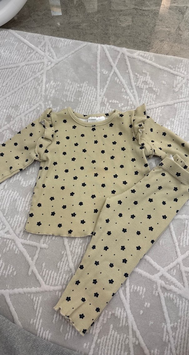 Bej renkli, uzun kollu, çiçek desenli triko bebek kız takımı. Omuzlarda fırfır detaylı, yumuşak ve rahat kumaş.