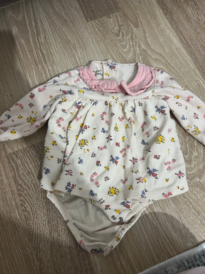 Uzun kollu, yakalı ve pembe fırfırlı detaylı bebek kız body. Beyaz zemin üzerine pastel renklerde çiçek desenleri bulunur.