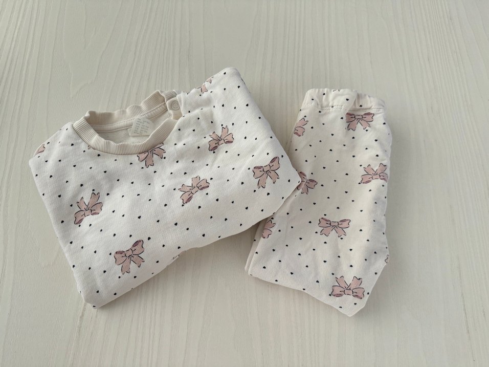 Uzun kollu, beyaz pastel renkli, fiyonklu baskılı bebek kız takımı. Üst ve pantolondan oluşur, şık fiyonk detaylıdır.